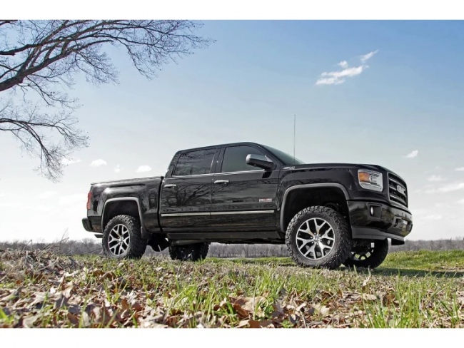 Get the look you really want with Rough Country's 6-inch Suspension Kit for 4WD '14+ Chevy / GMC 1500 Pickups. This massive kit affords your truck the ability to run 33-inch tires on factory wheels with our beefy lifted knuckles and is designed with 100% laser-cut materials for the best possible fit on your vehicle. Includes a set of front and rear high-clearance cross members featuring the "RC" logo and a differential skid-plate. Each kit also comes with a set of durable, fabricated anti-wrap lift blocks that offer a huge boost while helping prevent axle wrap issues. Give your pickup an aggressive, lifted and level stance with incredible ride quality! Our innovative Lifted Knuckle design boosts ride height while keeping all components at the optimum angles for a factory-like ride. This kit includes a set of rear N3 Shocks, balanced for on and off-road use. Includes Rough Country's Lifetime Replacement Warranty.