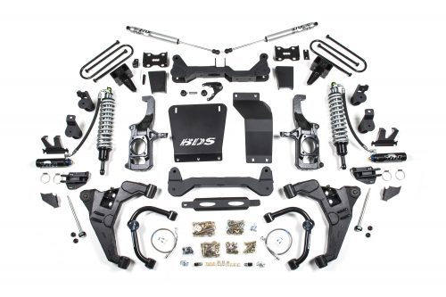 Along with the coilover conversion, this 6.5" system includes a pair of one-piece laser cut high clearance crossmembers, CNC machined ductile iron steering knuckles to correct tie rod angles, heavy duty front skid plate and differential skid plate to increase protection, multipoint differential relocation brackets to secure differential and correct CV axle angles, longer sway bar links and braided stainless steel extended brake lines. In the rear, BDS offer both a 3" and 5" rear block and u-bolt kit to lift and level the stance. The 5" rear block kit includes a u-bolt flip kit with new spring plate and the preferred round u-bolts for increased strength and ground clearance. To compliment the performance in the front this system includes precision tuned FOX 2.0 IFP gas shocks in the rear. This system allows for up to 37" tires to be installed.