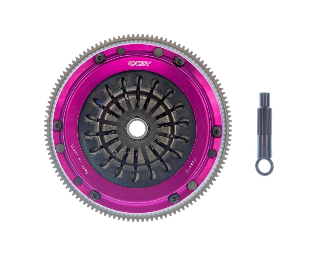 The EXEDY Hyper Single Series clutch is engineered to optimize the performance of cars that are moderately modified. Similar to our multi-plate clutches, it has a purple anodized, forged aluminum cover and maintains the pedal efforts at a reasonable level. Additionally, the pressure plate features a series of turbine-like vanes that keep the clutch cooler under extreme operating conditions. Hyper Single clutches come with a chromoly steel flywheel and a 6-puck cerametallic, sprung center damper disc assembly. However, on select vehicles, the new VF (Various Friction) disc may be offered. The chromoly flywheel is lighter than OEM for improved engine response. The disc is generally smaller and thinner than the OEM disc making for lower inertia and therefore quicker, easier shifting and less wear and tear on the transmission synchros. The higher clamp load and cerametallic friction facings give approximately twice the holding torque of the OEM clutch and higher than other single disc clutches. 6-Puck Cerametallic Disc: High friction coefficient, low wear, and a special heat resistant material [T5001] has been applied to enable the clutch size to be reduced which in turn lowers mass inertia and improves shift responses for faster gear. Durability is improved with the use of a stronger, smaller damper disc, designed especially for the Hyper Single clutch. VF (Various Friction) Disc: The VF enables the driver to operate the clutch through an easy-to-feel half engagement thanks to the Ultra Fiber friction material all while having a high heat dissipation and torque capacity due to the integrated metal facing. Furthermore, pedal effort has been drastically reduced and improved by the re-engineering and re-designing of the engagement point with newly developed cushioning plates. All EXEDY Racing Hyper Single Series Clutch Kits carry SFI 1.1 Certification. Which means, when you buy these products, you can be confident they are certified for use in competitive motorsports.