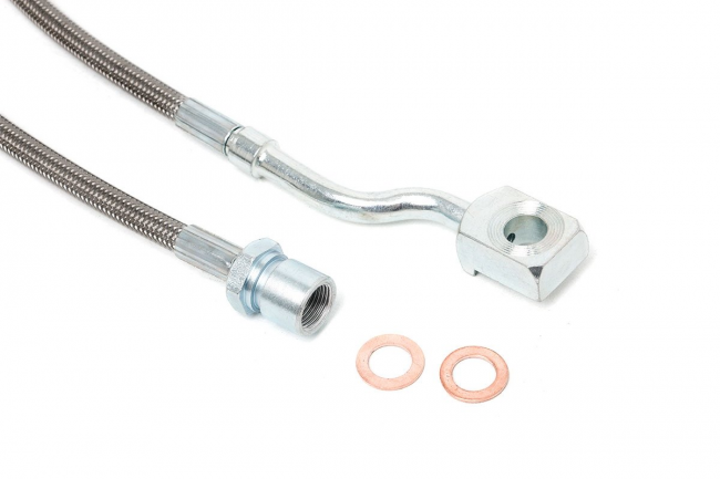 Upgrade your worn out rubber brake lines with Rough Country's Stainless Extended Steel Brake Line Kit. Our DOT approved brake line kits offer the necessary extra length to install your application, perfect for vehicles lifted 5in - 7.5in and for anyone who wants to swap out poor performing or decaying factory brake lines.Rough Country's Stainless Steel replacements offer superior protection and a seriously long lifespan. A braided stainless steel exterior keeps your lines free from off-road debris, rocks, and mud that can penetrate factory rubber lines. This durable outer layer also prevents expansion of the internal Teflon layer - even under 4,000PSI - keeping fluid moving to the brake line for a noticeably firmer brake pedal feel. High-quality hollow fasteners at both ends of each brake line provide a leak-free flow path.