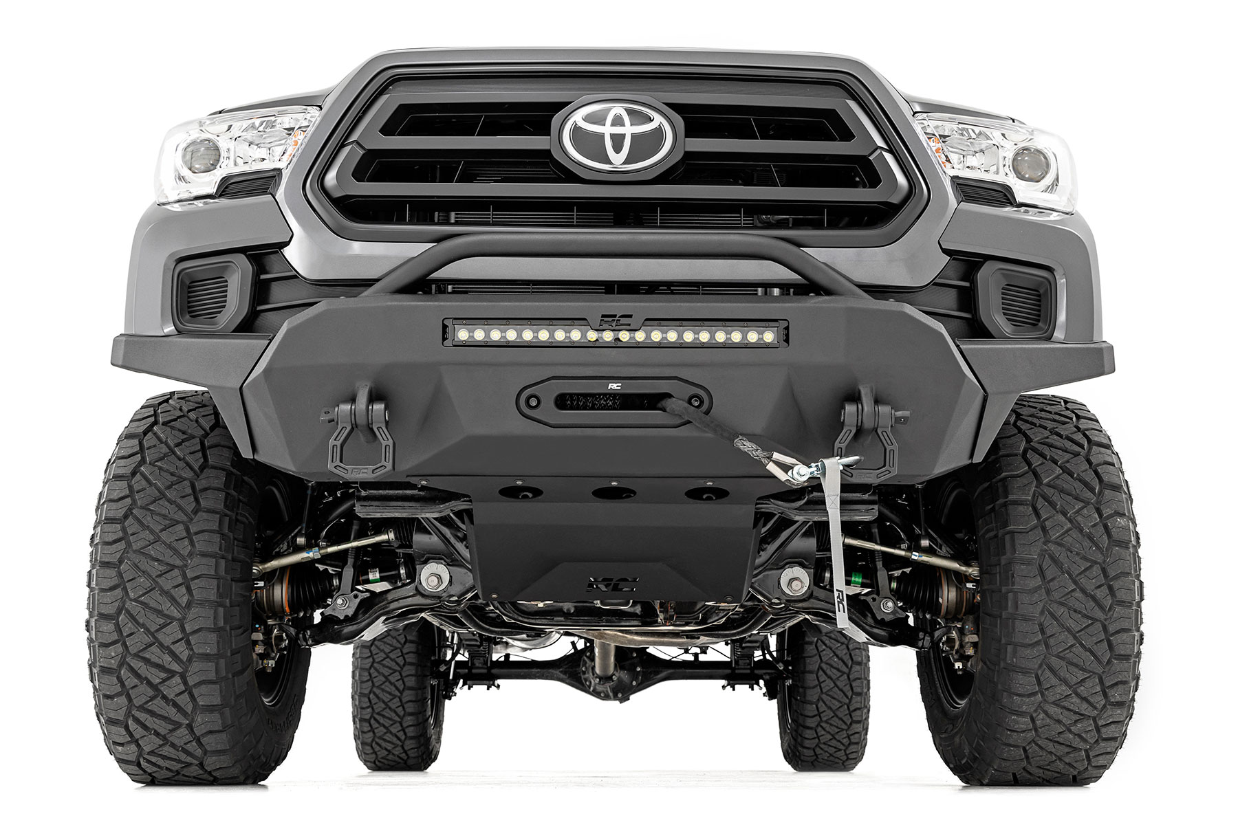 An eye-catching bumper at a fraction of the cost. Modular so you can select the exact configuration you prefer. Includes trim panels for optional LED light. Optional LED upgrade kit includes (1) 20in Single Row LED. Includes winch mounting plate. Durable black powder coat. Includes D-Ring Mounts and D-Rings. Optional Winch upgrade combos include (1) PRO9500S or PRO12000S Rough Country Winch.
