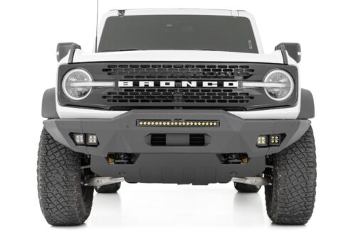 Add an Aggressive Style. Looking to add some attitude to your Bronco? Check out our Rough Country Front Bumper. This bumper will transform the appearance of your vehicle and protect your lights and engine from potential damage. Manufactured to be a perfect fit for your Bronco and provide maximum ground clearance, our bumper is designed to overlap the factory grille shell for looks and light bar fitment. Since it fits Rough Country's 20" light bars, with an option to add additional cube lighting on the side, you can upgrade your visibility at night and give your vehicle a touch of style.