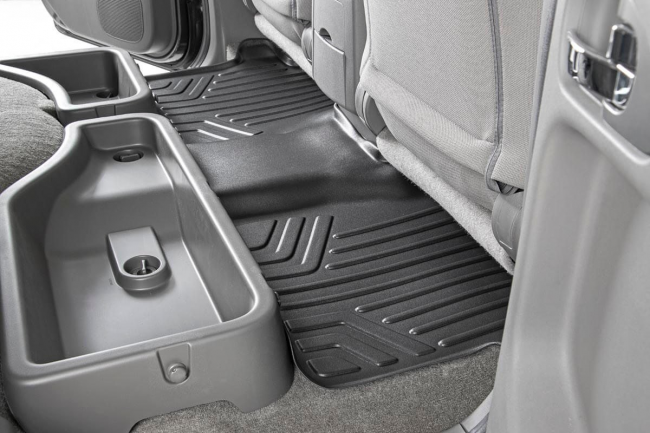 Keep your carpet in pristine condition with Rough Country's Floor Armor: Heavy Duty Floor Mats and Rear Cargo Liners. These eco-friendly, semi-flexible floor mats are made of an ultra-durable Polyethylene that offers a strong, rigid shape that's incredibly easy to clean. Where simple rubber floor mats fail, Rough Country's line of Floor Armor is guaranteed for life and will never crack, split, or break-down over time. The high-quality design extends the lifespan of your carpets and the raised-lip design ensures your interior will always be protected from mud, moisture, and more. These contoured floor mats are laser-measured for each make and model; designed to be a precise fit that grips the carpet and stays put. An aggressive looking textured surface gives your muddy shoes plenty of traction and looks great inside the vehicle. No matter what you track in, Rough Country Floor Armor is incredibly easy to clean. Just pop them out of the floorboards and rinse away the dirt! Includes Rough Country's Lifetime Replacement Warranty.