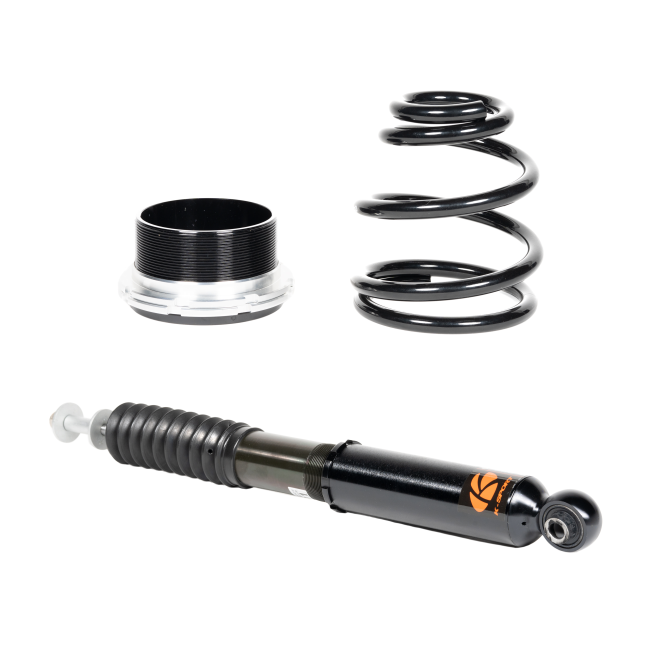 Ksport Version RR coilover System is built specifically for road racing only. Aggressive rates and valving are chosen for maximum handling and performance with acute reaction and responsiveness. Integrated with 36 levels of damping adjustment, simultaneous compression and rebound adjustment, lightweight aluminum mounts, and pillow ball upper mounts on some applications. (Race use only.) 36 levels of damping adjustment allow you to fine tune the ride to your handling and comfort needs. The damping adjusts compression and rebound simultaneously for ease of adjustment. Pillow ball top mounts in the front and rear on some applications allow you to maintain vehicle manufacturer suspension geometry design. The pillow ball top mounts also allow you a more direct feel for solid driver response. Camber adjustment via the Pillow-ball Mount is available for certain applications, allowing camber adjustment without an additional “Camber Kit.” Most applications utilize an adjustable lower mount, which means you adjust height without losing suspension travel like some other coilover designs do. With the mounts and most pieces of the coilover being designed for 6061 billet aluminum the kit is lightweight, durable, and rust resistant. The steel shock body is electroplated with zinc to resist rust and the elements. The valving of each set is matched to the springs installed for unmatched ride quality and reliability. The Ksport system uses a Monotube design in which the oil and gas are separated within the cylinder. When compared to twin tube designs the Monotube dissipates heat better, allows finer damping adjustments, and requires a more expensive design process. Aeration and cavitation are a lot less common in a Monotube design, which results in a better ride.