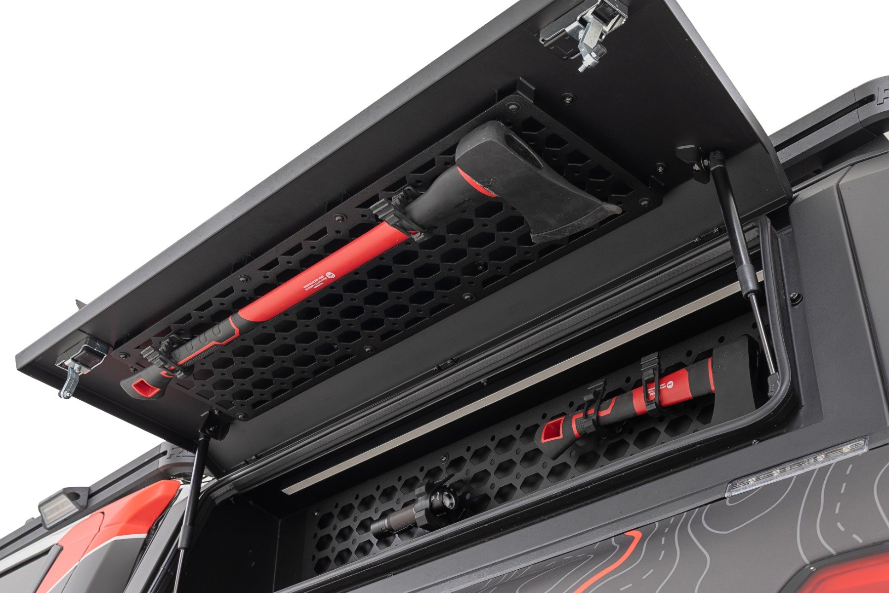 Simple Bolt-On Installation: Designed for quick and easy installation using existing mounting points inside the wing door of Rough Country Bed Cap Storage Bins with no cutting or drilling required.