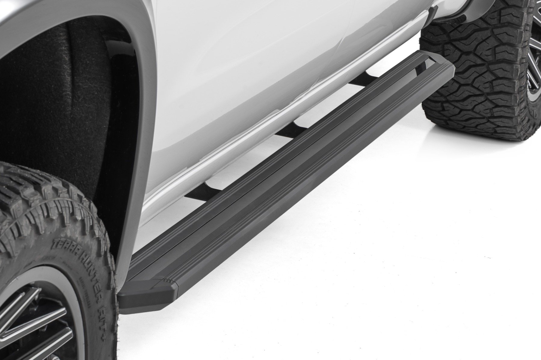 Revolutionize the way you step into your truck with Rough Country's Bluetooth-Controlled Running Boards! Designed for those who demand both cutting-edge technology and rugged durability, these premium running boards combine wireless convenience, customizable LED lighting, and rock-solid construction into one sleek package. Whether you're looking for enhanced accessibility, extra protection, or a bold new look, these running boards deliver the perfect blend of functionality and style-all at the touch of a button.Wireless Control at Your Fingertips: Step into the future with Bluetooth-controlled running boards that offer seamless access and fully customizable LED lighting. With a simple app-based control, you can adjust step settings and personalize lighting effects effortlessly.Built Tough with Premium Aluminum: Designed for durability, these one-piece aluminum running boards are lightweight, corrosion-resistant, and ready for any terrain. The sleek cab-length design provides full coverage while protecting your truck from road debris and rock chips.Custom Lighting Like Never Before: Express your style with 234 color options, 12 dynamic effects, and five preset color saves. The integrated LED strip and RC puddle lights enhance visibility for safer nighttime entry and exit, while the adjustable step lighting lets you set the perfect delay from 1 second to 10 minutes.Seamless Fit for Any Setup: Whether your truck has a body lift or not, these running boards are engineered for a perfect fit. The sleek frame coverage also conceals exposed components for a clean, factory-like finish.Easy, Bolt-On Installation: No need for complex modifications-these running boards feature a hassle-free, drill-free installation so you can get back on the road fast. Designed for convenience, strength, and style, they're the ultimate upgrade for your truck.Backed by Rough Country's Leading Warranty: With a Limited Lifetime Warranty, these running boards are built to last. Whether you're hitting the trails or cruising the streets, you'll have peace of mind knowing your investment is protected.