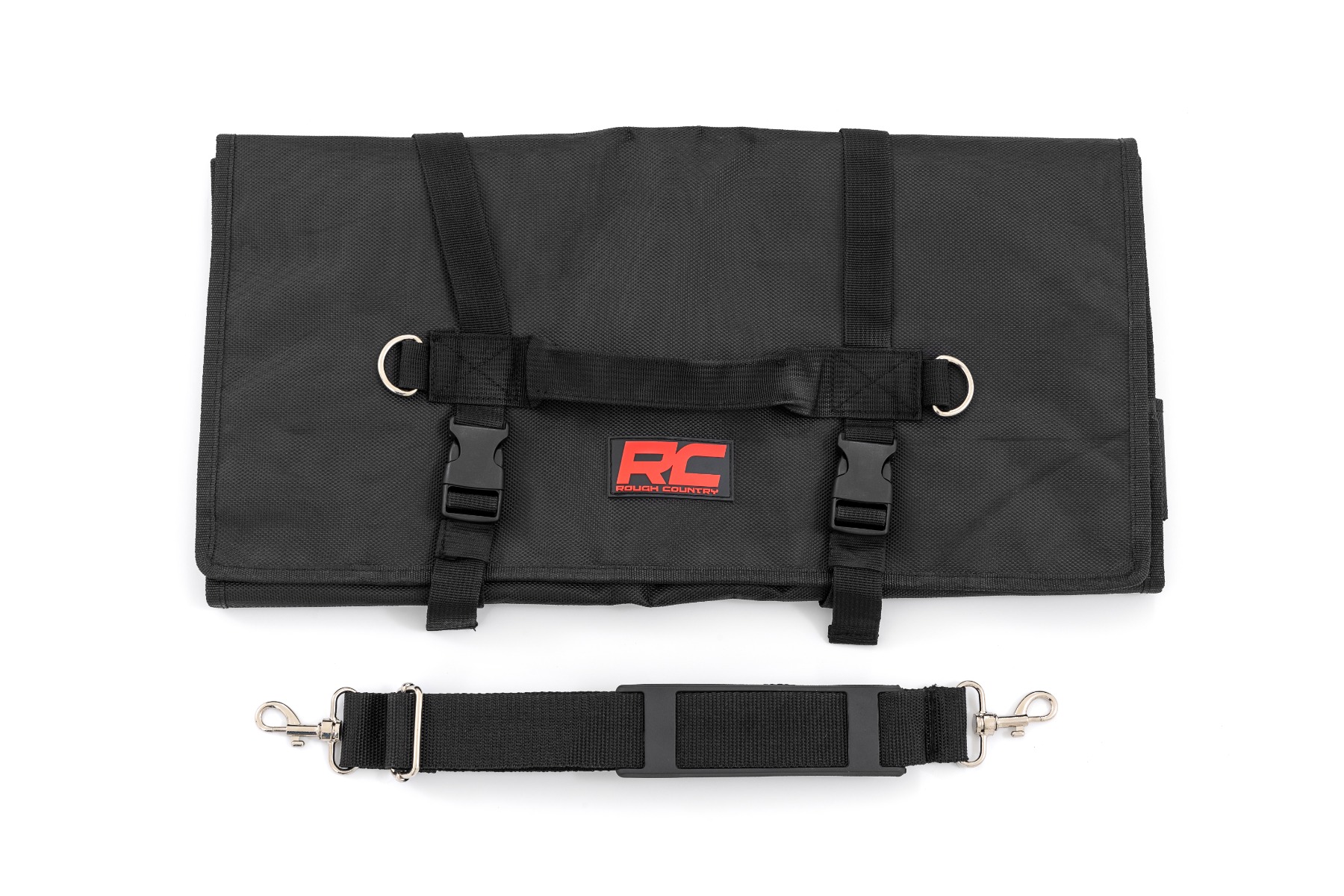 Tired of digging through a cluttered toolbox to find the right tool? Rough CountryΓÇÖs Roll-Up Tool Bag is designed to keep your tools organized, secure, and within reach, so you can spend less time searching and more time conquering the trails.Massive Storage: With 35 individual slots, you'll have plenty of room for everything from hammers to Allen wrenches. Plus, the dedicated socket pocket ensures your sockets are always organized and ready to go.Dead Silence: No more rattling tools driving you crazy. The Velcro closures on top, bottom, and socket pocket keep your tools securely in place, so you can focus on the ride.Easy Roll-Up and Go: Need to pack it up quickly? The quick-snap buckles and cinch-tight straps make it a breeze to roll up and secure your tools.Built to Last: Crafted from water-resistant nylon oxford material, this tool bag is built to withstand the toughest conditions and keep your tools protected.Easy Carry: The comfortable grip handle and strong X-stitched shoulder strap make it easy to carry your tools, no matter where your adventure takes you.This tool bag is ready to go wherever you are. Whether youΓÇÖre tightening things up or making trail-side repairs, having your tools organized and in reach means less hassle and more adventure.